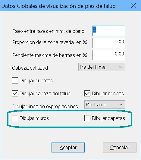 Antes estas líneas se pintaban en planta siempre que estaban visibles los pies de talud, y se ocultaban cuando se ocultaban estos; ahora, adicionalmente a ese comportamiento, se han añadido dos indicadores que permiten decidir si las líneas del cuerpo y de la zapata de los muros están o no visibles estando visibles los pies de talud:
