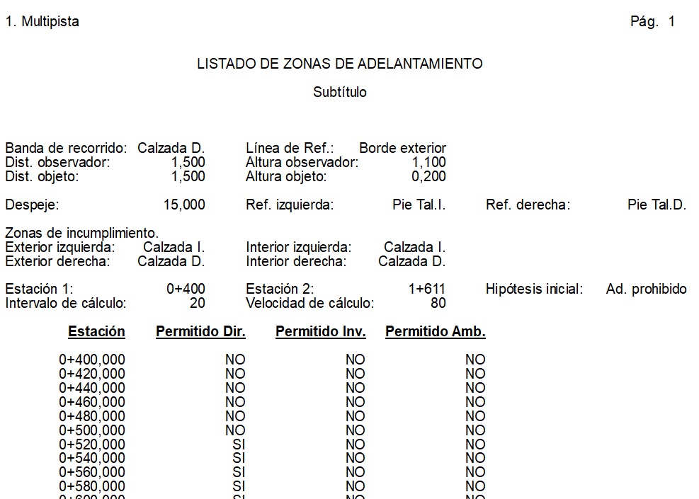 - desde el Árbol del trabajo, botón derecho sobre el nodo del tramo → Informes → Estudio de visibilidad → Visibilidad de adelantamiento ... → Imprimir zonas de adelantamiento